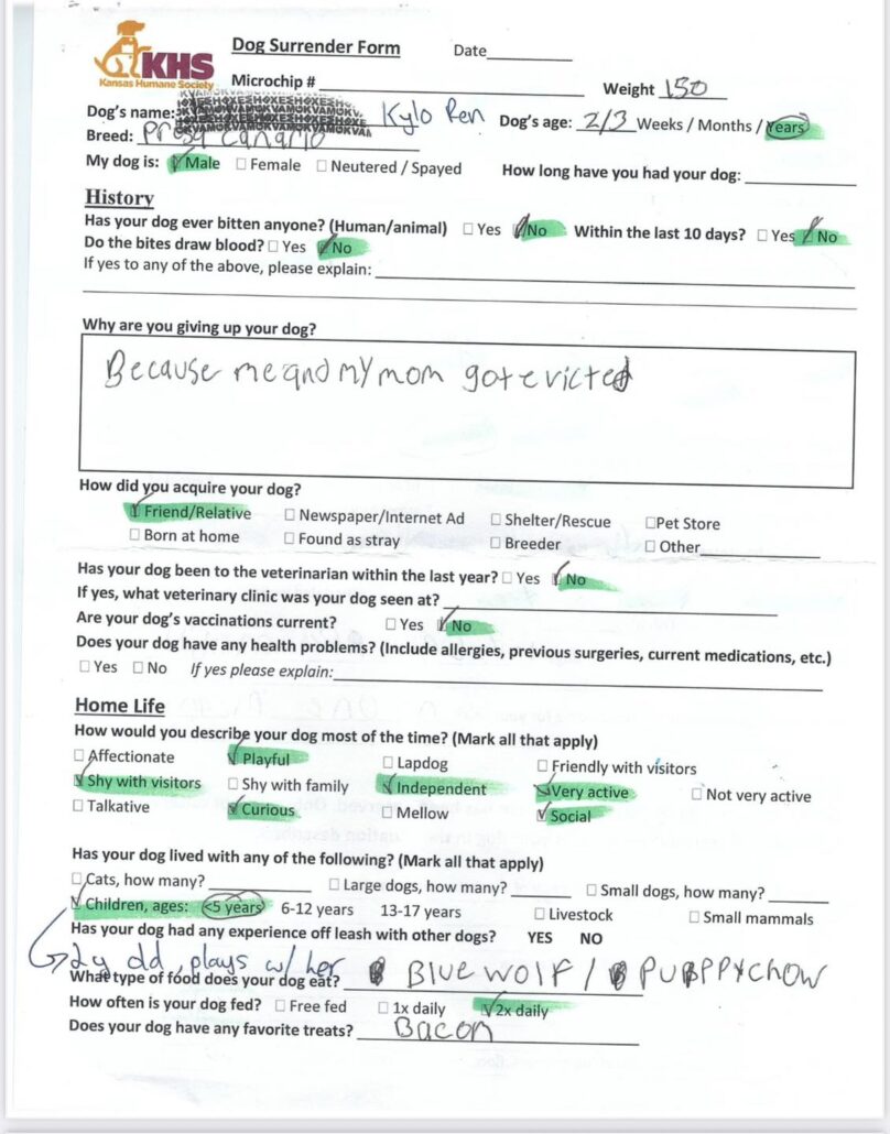 Kylo had been surrendered to the Kansas Humane Society after his family was evicted and had no one to take care of him. The dog had initially been accepted by the Kansas Humane Society, but because he tested positive for heartworms, he was no longer a candidate for adoption. There had been no interest from fosters or adopters, and his time was running short.