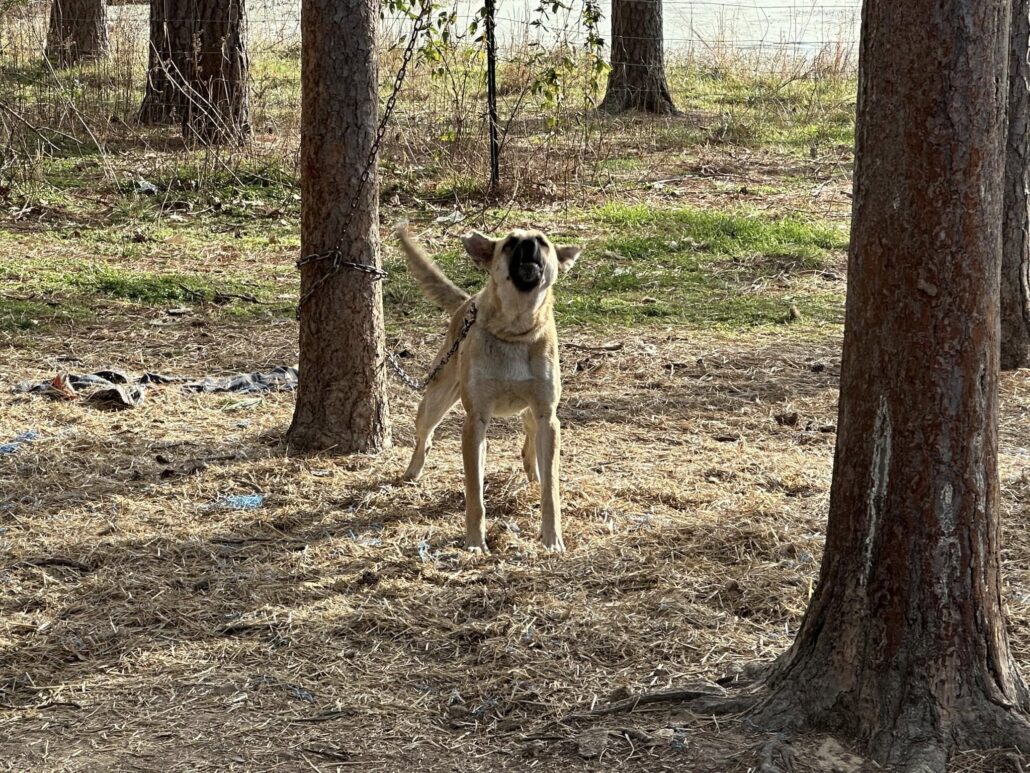 When rescuers arrived, some of the dogs had been living chained outdoors in the inclement weather. Others were running loose. Just a few days ago, one of the puppies had been struck and killed by a car on the nearby road.