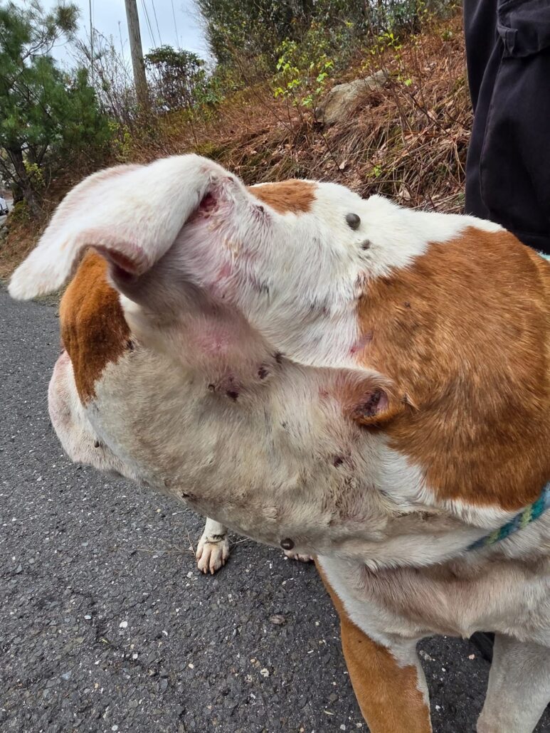 When Tony was found, he was covered in what counted out to be 890 ticks. His ears had been so full of ticks, the insides looked black. He also suffered from bite wounds and punctures. And as if that wasn’t enough, he was severely anemic, exhausted and emotionally broken.