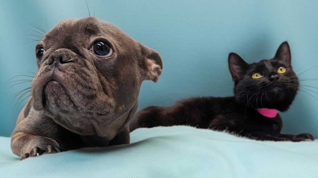 Blueberry is a one-year-old French bulldog blend who weighs in at just 14 pounds. Meadow is a seven-month-old black kitten who arrived at nearly the same time; both little ones having experienced trauma that required each of them to lose a leg by surgical amputation.