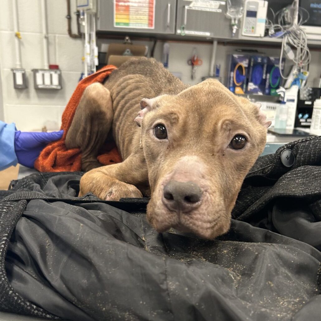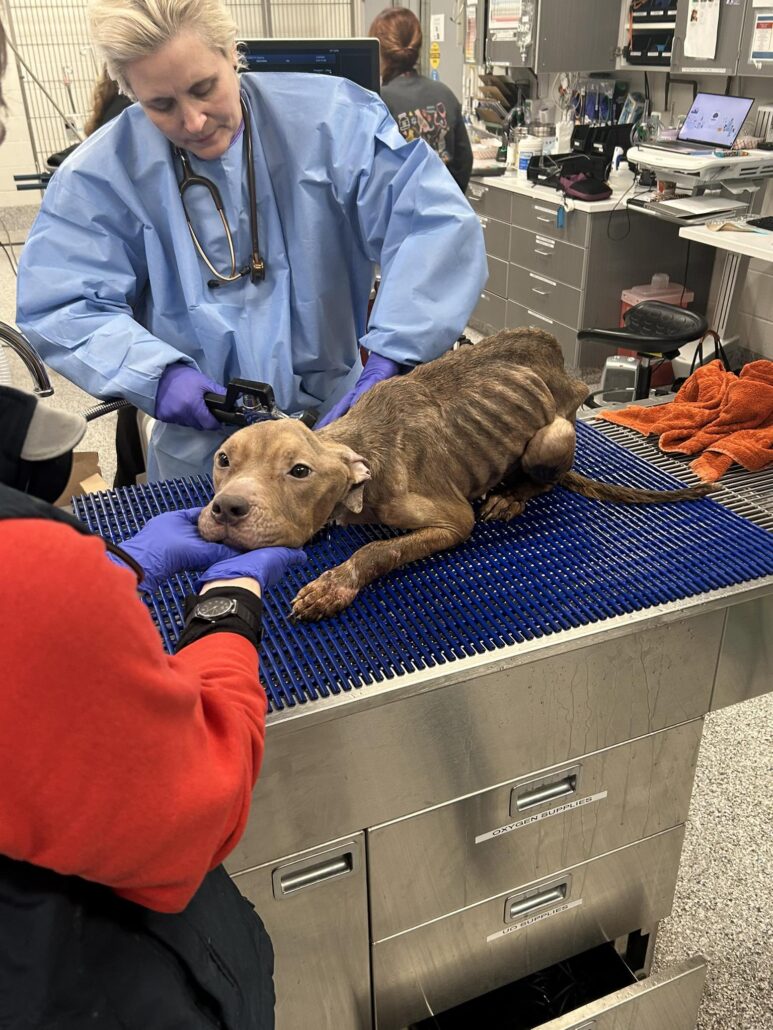 The two-year-old mixed breed Staffordshire terrier had been receiving around-the-clock care and was on a carefully monitored “refeeding” program in order to prevent refeeding syndrome; a dangerous complication of reintroducing food too quickly to starved animals. She had the lowest possible body weight score and also arrived with wounds on her feet and tail.
