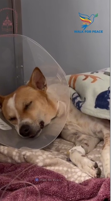 His journey is truly special—he was once a stray wandering in India who began following the Venerable Monks. He walked with them for over 100 days across India, very much like the WalkForPeace we are on today! Though his exact birthday remains a mystery, his loyalty and peaceful spirit are clear to everyone he meets.