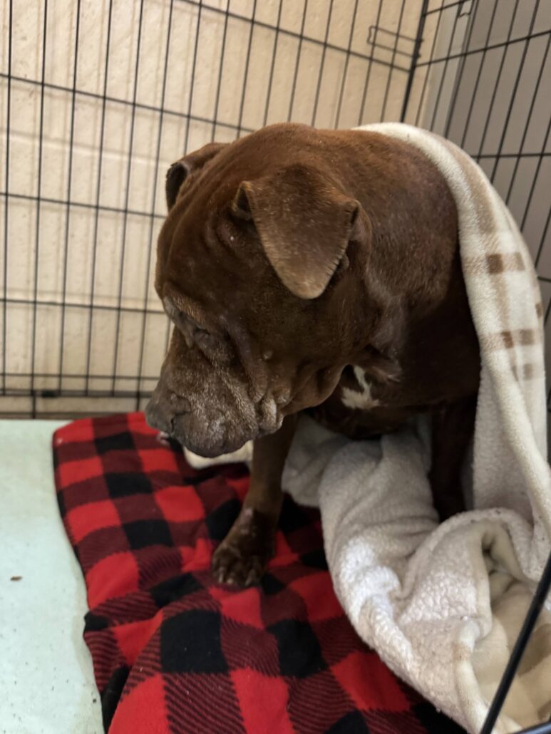 The senior was discovered in rough shape and inexplicably smelled of gasoline. Her owners told the agents they could not afford to take her to the vet; the dog named Navy(Bean) was little more than skin and bones.