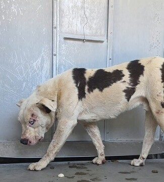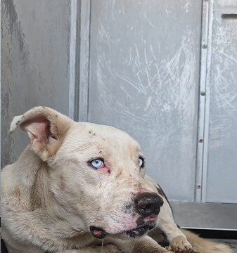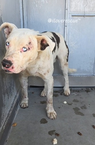 Before he ever made it into the shelter, you can already see this boy hasn’t had an easy life. His body tells that story for him. Wounds, a dull coat, the kind of wear that doesn’t come from one bad day, but from many. From time spent without care, without comfort, without someone looking out for him.