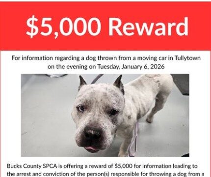A $5,000 reward for information leading to the conviction of the perpetrator(s) has been offered. Anyone with information about this investigation can use the Bucks County SPCA report cruelty tip line at 844-SPCA-TIP (844-772-2847) or [email protected].