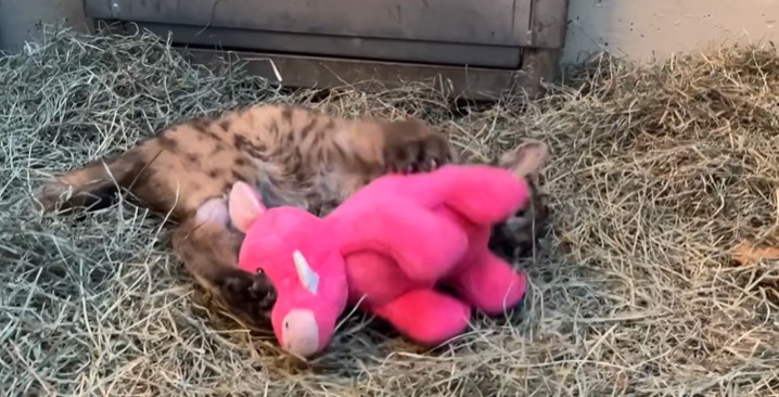 “This intrepid orphaned puma continues to improve, and is starting to build more muscle. Like many of the rescued cubs we care for, Clover has signs of ringworm, and we are treating her for that. Our mountain lion rescue team is giving Clover lots of attention, so she knows she’s not alone. Enrichment like this pink piggy help give Clover a sense of companionship, which improves her wellbeing immensely.”