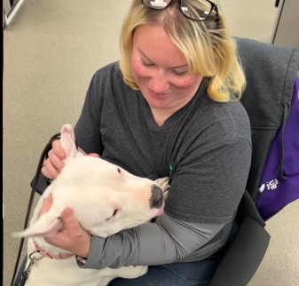 The five-year-old pit bull mix quickly captured attention with her unique habit; she hugged everyone. Since arriving at the shelter, Zar had quickly connected with staff and volunteers; it was nearly impossible to ignore the full-body hugs she offered throughout the day.