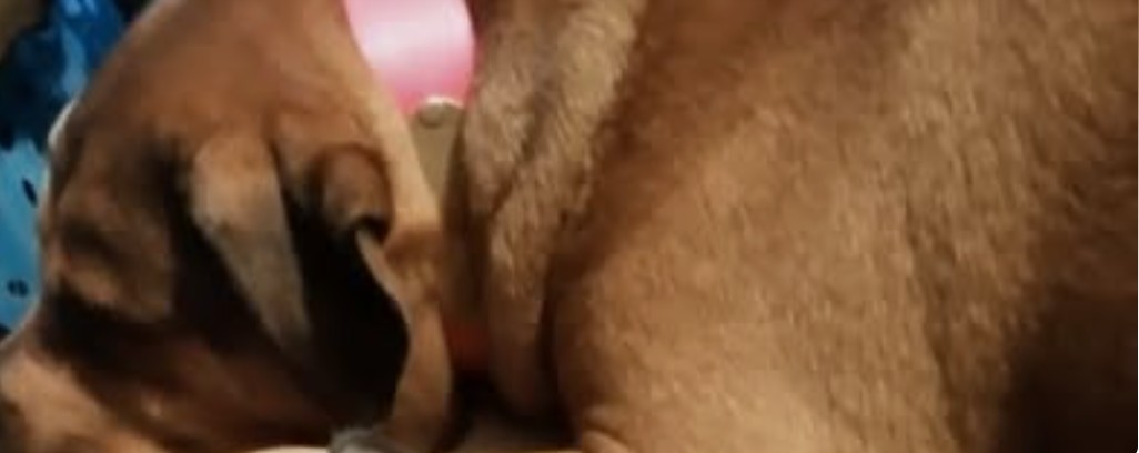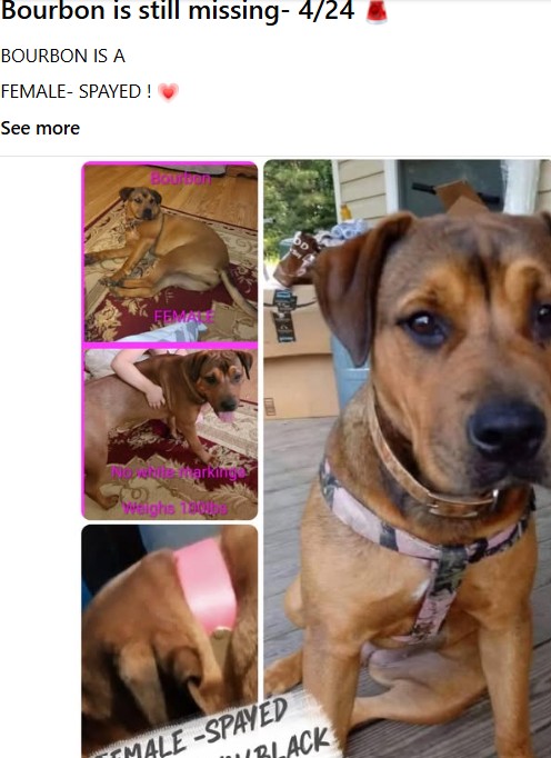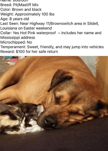 Calinda adopted Bourbon, a pitbull Mastiff mix when the pup was four months old and rescued her from an abusive situation. Bourbon, now an adult dog and weighing approximately 100 pounds is best described as a very friendly “velcro” dog that loves people and will often jump into their cars if given a chance. She was last seen wearing a hot pink collar with her name and Calinda’s address on it when she went missing. She does not have a microchip.