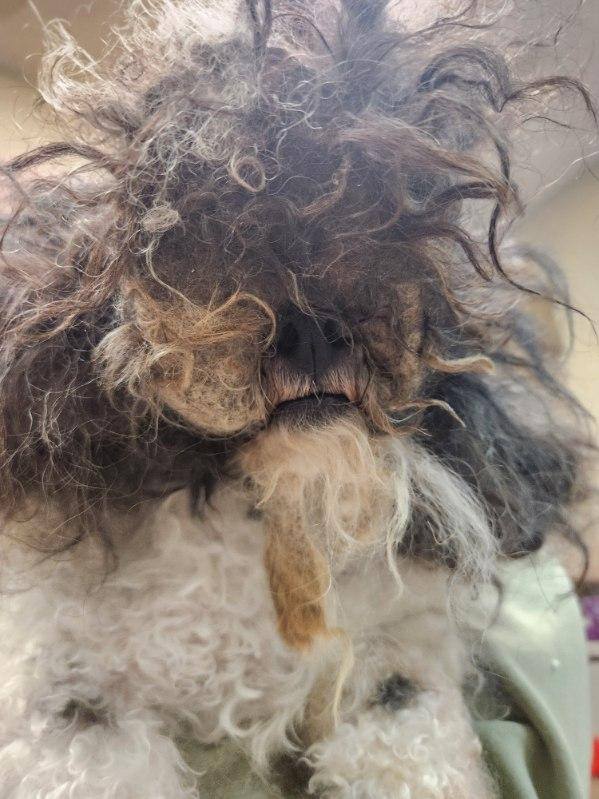 At the Benton-Franklin Humane Society in Kennewick, Washington, Bluey had been surrendered to the shelter on Tuesday. Needless to say, he was a mess. His fur was matted nearly four-inches thick across his face; his ears were hidden beneath the hard mass of hair and filth.