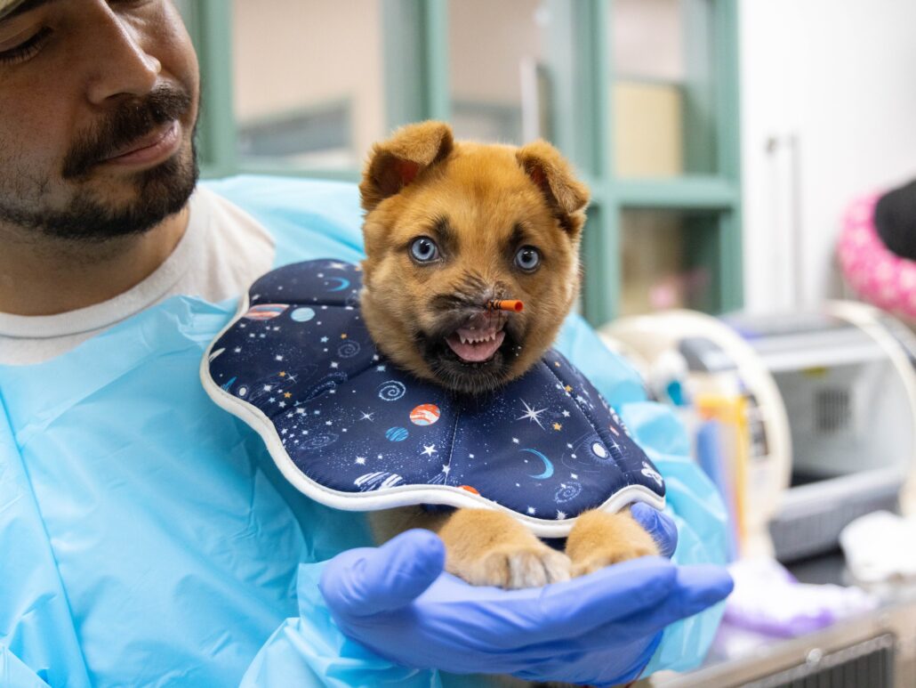 Because there had not been enough skin to close the wound, Peanut’s nose has been slow to heal. In order to help him breathe, a stent had been placed in his nostril to keep it open.