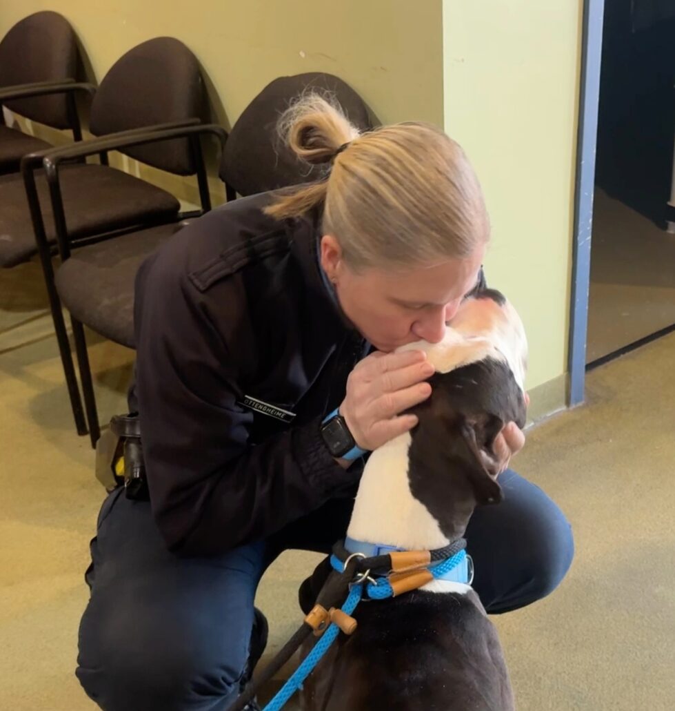 Hearts absolutely exploded! Wallace gave each of the officers lots of grateful kisses and no doubt thanked them profusely for saving his life and bringing him to Stray Rescue.